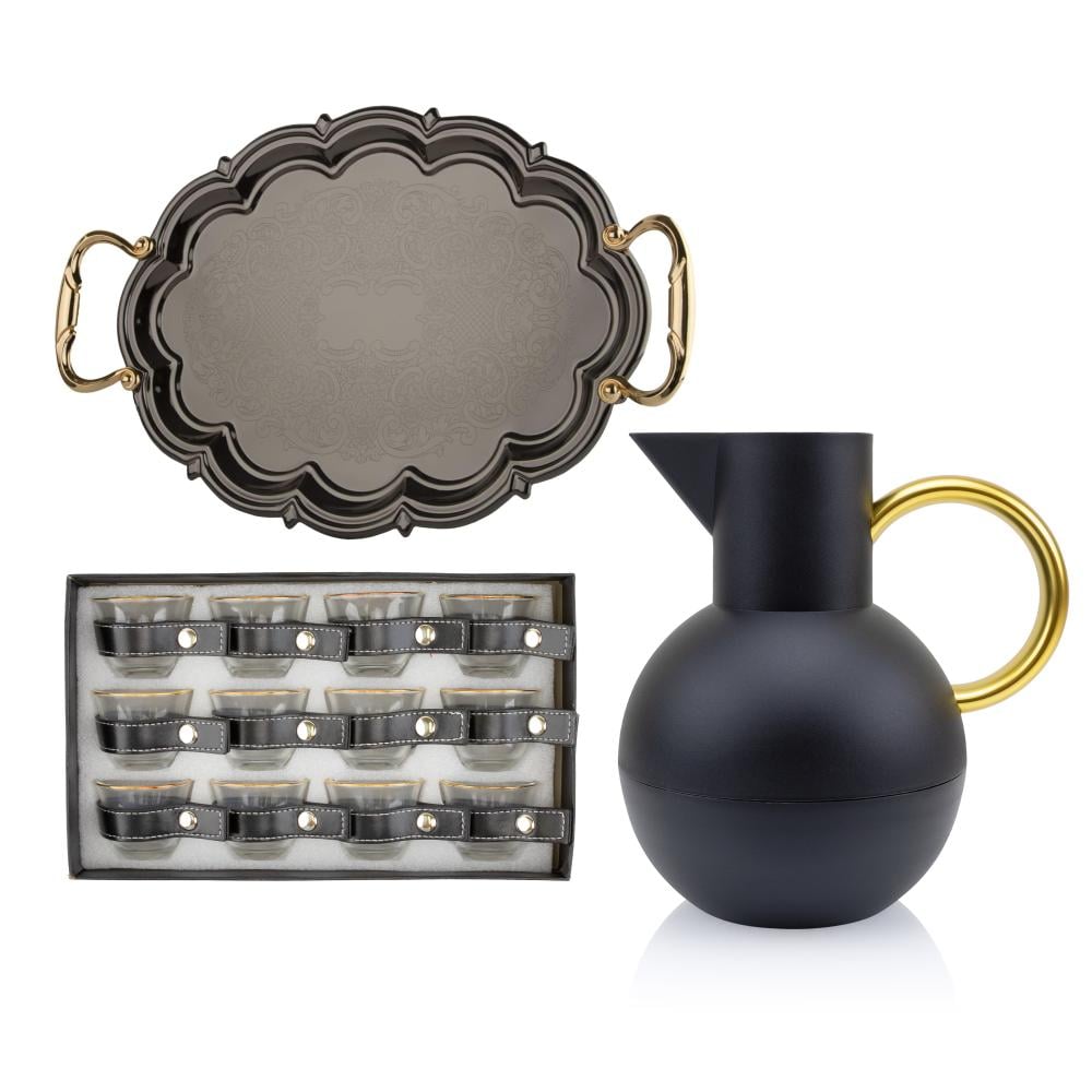 ثلاجات 1.0 لتر اسود مع ذهبي + صينية تاليس 2 حبة اسود ذهبي + فناجيل قهوه 12 حبة