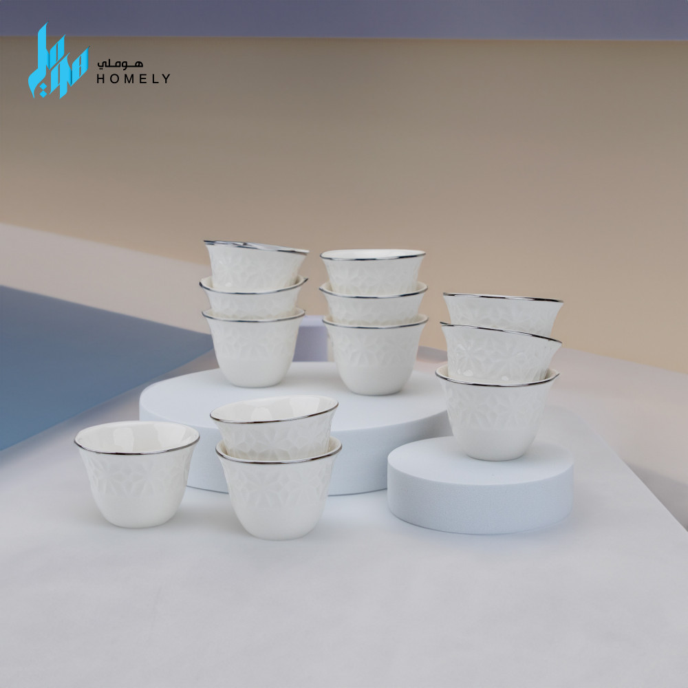 - يتكون طقم فنجان القهوة من عدد اثني عشرة فنجان مقاس وسط، يتميز الطقم بلونه وتصميمه العصري التي يتناسب مع كافة الأذواق.