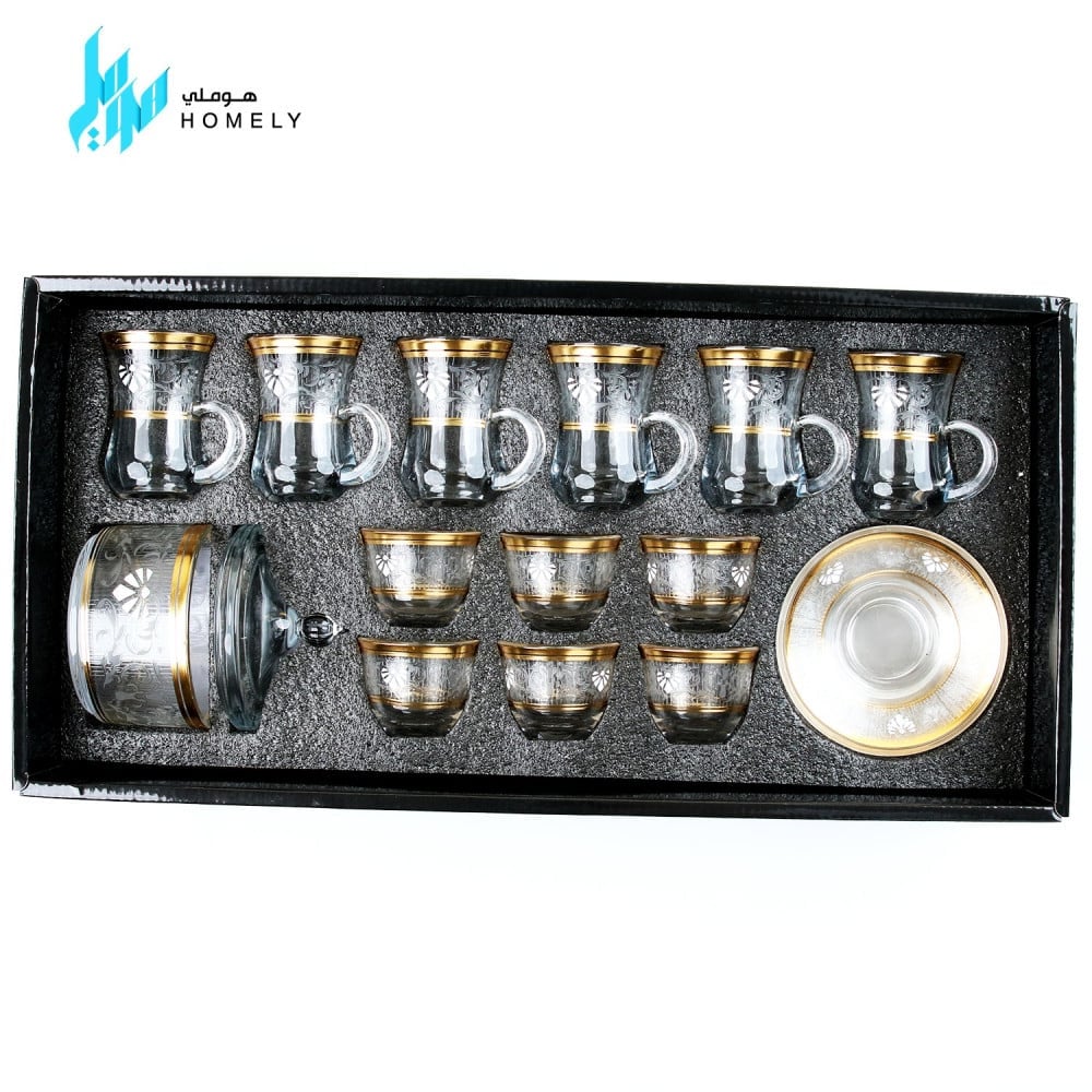 - يحتوي على طاسة زجاجية ومعها غطاء، وهي مخصصة لتقديم التمر أو السكر مع القهوة.