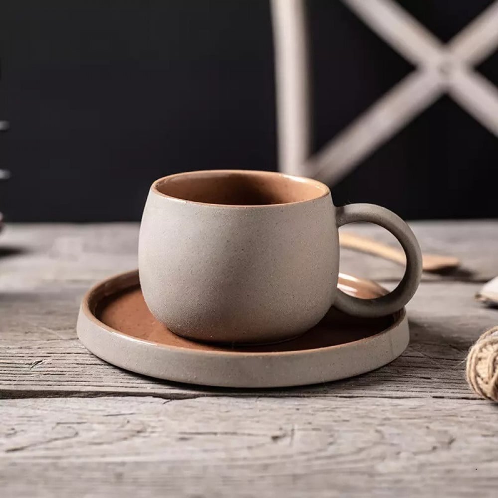 - كوب القهوة مصنوع من البورسلين القوي، ويأتي معه صحن خشبي 250 مل رملي وبني.